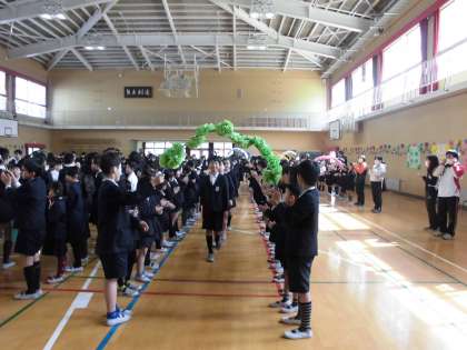 全児童・教職員の作ったフラワーロードを通り抜け、