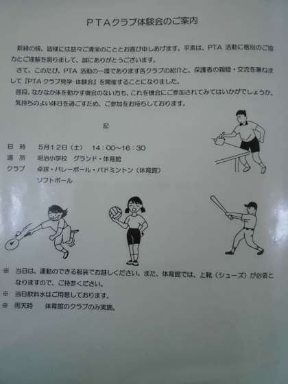 今週12日(土)にPTAクラブ体験会が行われます。