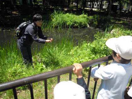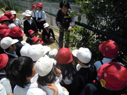 ビオトープクラブの指導に来ていただいている金下さんにゲストティーチャーとして、理科の学習に入っていただきました。阿波座南公園や校庭でチョウの幼虫のえさになる植物についてお話をしていただき、ミカンの葉についたチョウのたまごをみんなで見つけました。