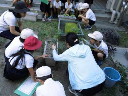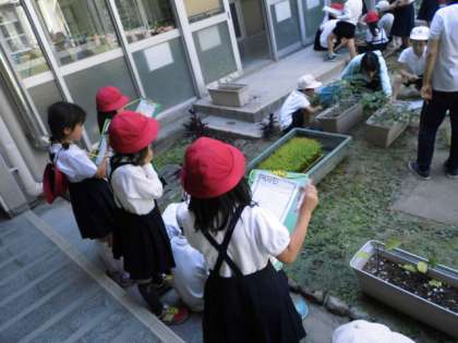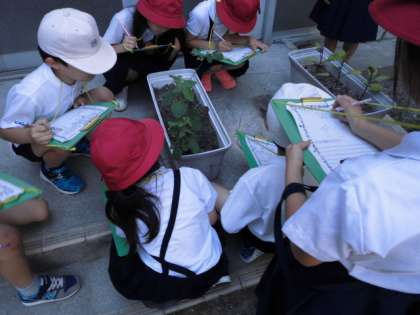 育てている「なす」「きゅうり」「だいず」の成長を調べています。葉の数や茎の色などそれぞれの違いを観察し記録しました。
