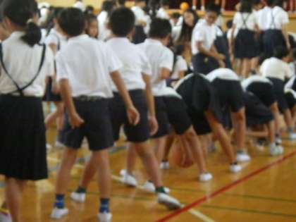 2学期最初の児童集会は全校児童で「ボールおくり」のゲームをしました。