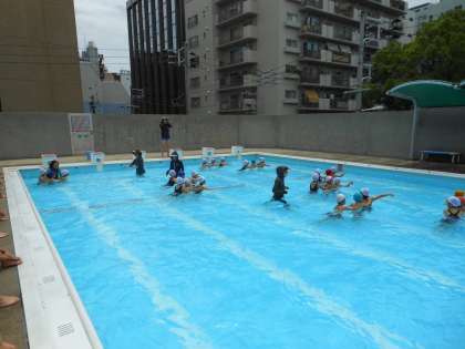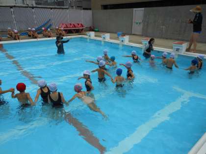 心配されたお天気がうそのように、夏空のもと、靱幼稚園の子どもたちとプールで交流しました。大きくて深い小学校のプールに幼稚園の子どもたちもドキドキ。しかし、そこは1年生がしっかりとエスコート。泣いている子ををなぐさめたり、こわがっている子にやさしく声をかけたりしていました。そして、一緒に宝探しや汽車ごっこなどで楽しく遊びました。いいおにいさん、おねえさんでしたね。