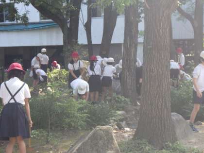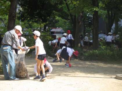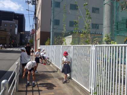 今日の一斉清掃、中学年は阿波座南公園と学校周辺を清掃しました。