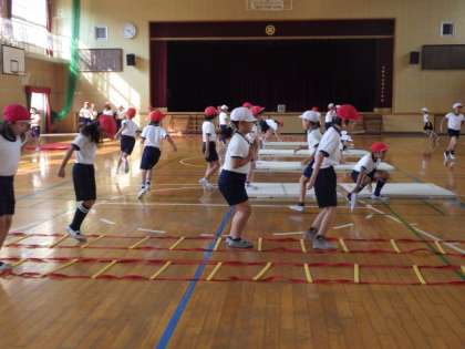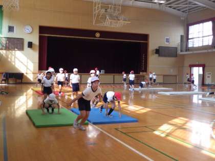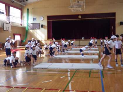 マット運動の器械運動領域を中心にいろいろな動きをしました。