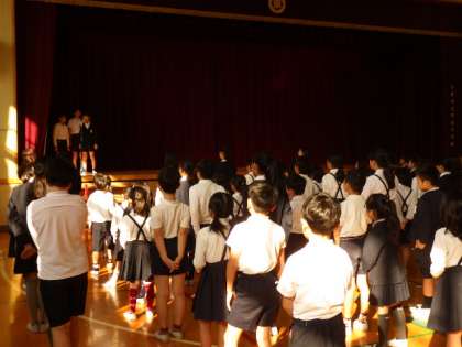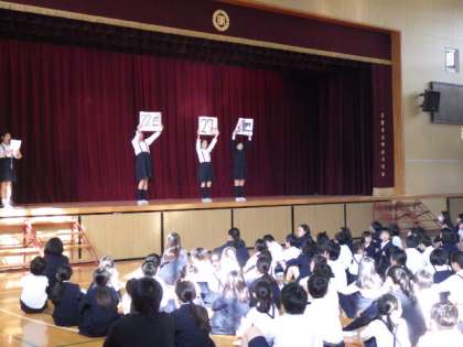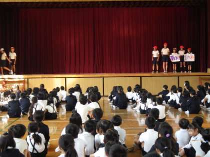 今日の児童集会はクラブ発表でした。室内運動クラブでは毎回みんなが楽しく活動できるようにしています。クイズ形式の楽しい発表でした。