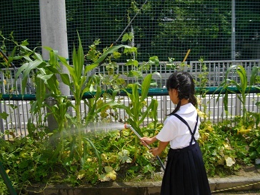 5年生では、稲のほかに、おもちゃかぼちゃ、とうもろこし、インゲンマメを植えてみんなで育てています。