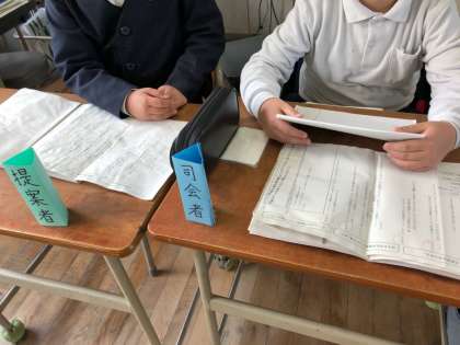 四年二組では、二学期の最後にみんなで思い出作りをしようという意見が出て、学級で話し合いをしました。クラスの学級係が司会として、楽しい時間を作るための内容について意見を出し合いました。初めはみんなドキドキしていましたが、だんだん慣れてきて、賛成の意見、反対の意見を堂々とみんなに伝えることができていました。