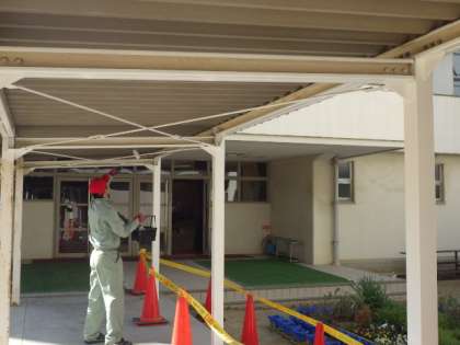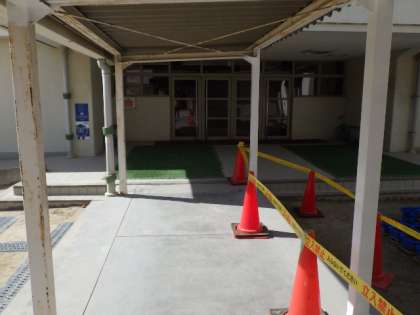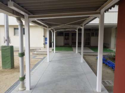 校舎から体育館に行く通路の柱をペンキで塗りました。