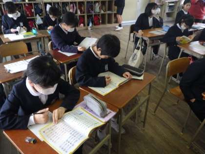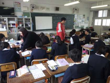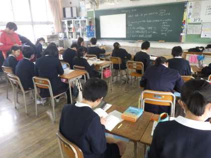 の質問の答えを自分たちで理由をつけて英語で考えています。