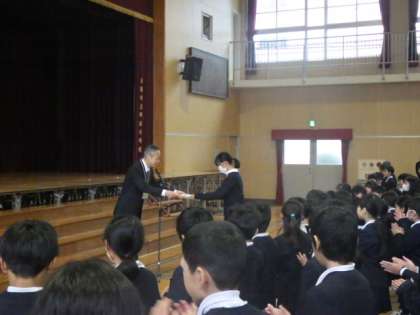 校長先生から、先日行われた、西区子ども会主催ソフトボールとキックベースボール大会で準優勝したソフトボールチームと3位に入ったキックベースボールチームの表彰が行われました。