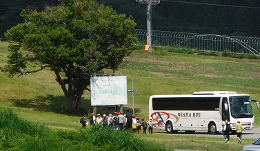 予定とは少し変更して、部屋割りの前に高原のモニュメント前で集合写真を撮影しました。同行のカメラマン「コンちゃん」が気合を入れて撮影してくださいました。