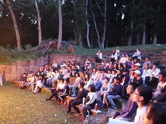 19時過ぎから行ったキャンプファイヤーですが、あたりが暗くなるのはもう少し後でした。暗くなるまでは代表の子ども達がちょっとした出し物をして楽しみました。