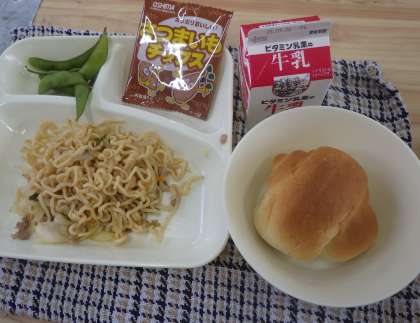 【焼きそば、枝豆、パン、おさつチップス、牛乳】