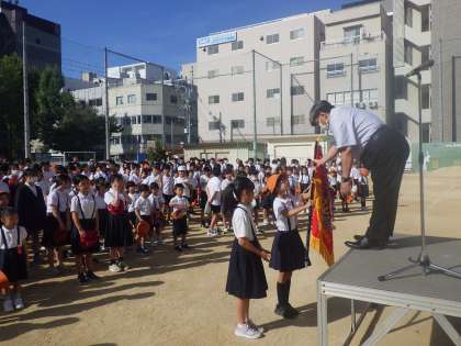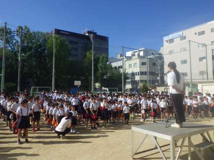 今日は2週間ぶりの児童朝会でした。子ども達も、秋らしくなってきた風を感じての児童朝会です。
