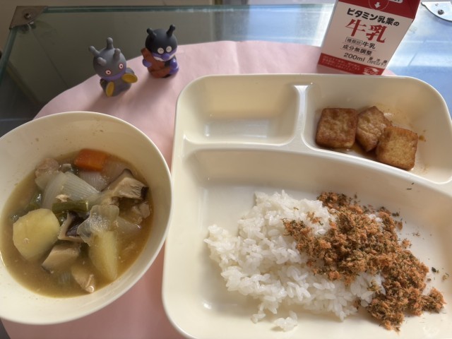 「鶏肉とじゃがいもの煮もの あつあげのしょうゆだれかけ 紅ざけそぼろ ごはん 牛乳」
