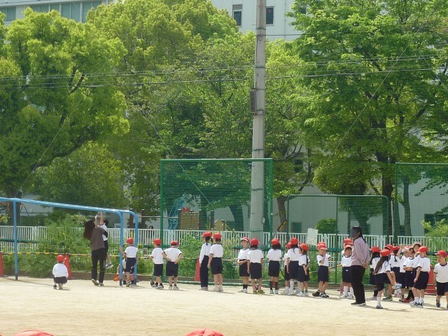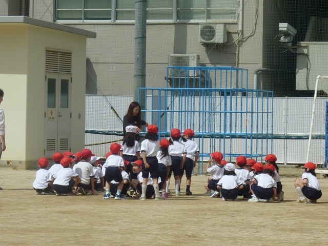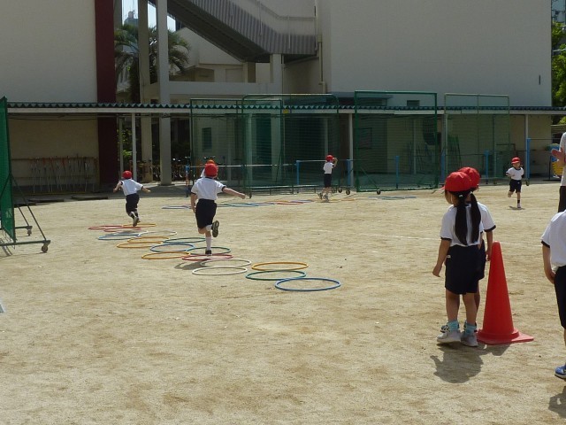 1年生が運動場で体育をしていました。