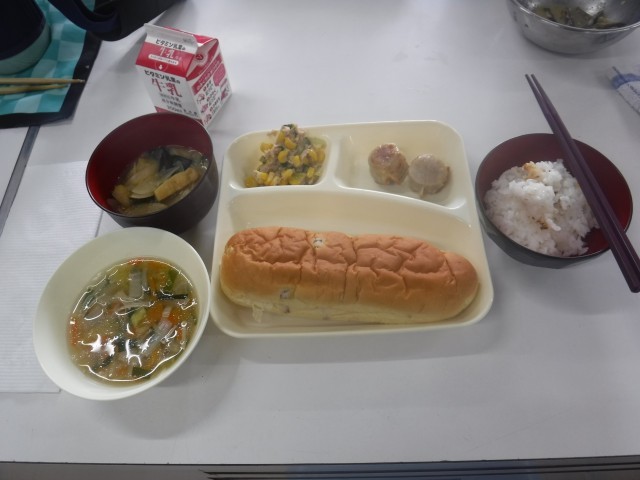 今日は、パンの日だったので、給食のパンとスープ、調理実習のご飯と味噌汁を食べました。