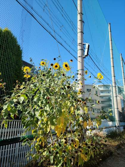秋が深まりつつありますが、運動場の片隅では、ヒマワリがまだまだ元気に花を咲かせています。