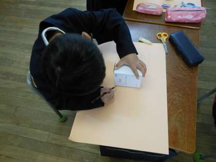 今日は「はこの面」を画用紙に写してみようということで、友だちに箱をもってもらうなど協力して写し取っていました。最後に面を切り取ってわかったことを発表しました。 さて、いくつの面があったかな? -