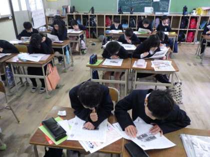 安全に気を付けながら、大掃除。今日配られた、PTA新聞を読んでいます。