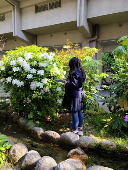 春の生き物の様子を見つける課題で、自然の様子を熱心にスケッチしていました。