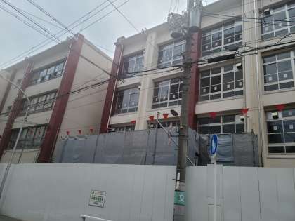 新校舎の北側の足場が撤去されつつあります。明治小学校の正門側(現在は閉鎖中)に新校舎の姿が現れました。