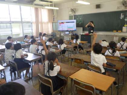 掃除の時間と5時間目の間の時間を「Meiji Time」として外国語に親しむ時間を設けています。