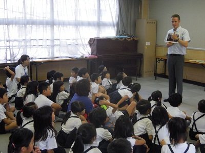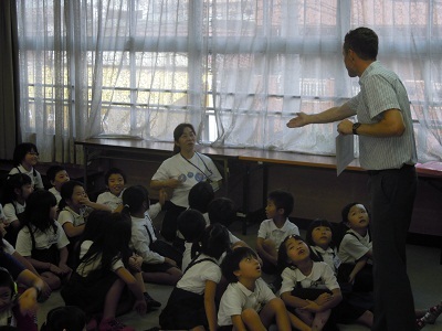 本校では、低学年から外国語活動を少しずつ取り入れています。バレット先生に子どもたちから質問がたくさん出ました。最後は英語のゲームを楽しみました。 -