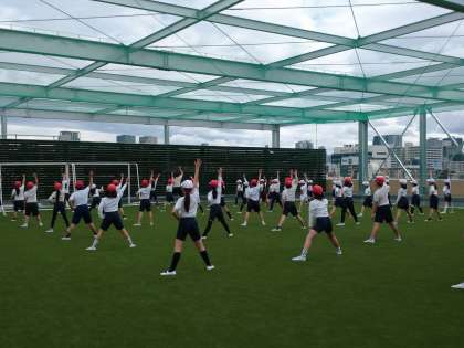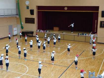 運動場、屋上運動場、体育館、いろいろな場所で運動会の練習を行います。子どもたちは団体演技の振り付けを覚えています。音楽にのって体を動かす楽しさを味わってほしいです。