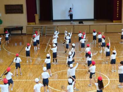 手作りのパーランクを叩いて、エイサーを練習しました。パーランクほ段ボールを材料にして作りましたが、叩くとなかなかいい音がします。沖縄の雰囲気が出るよう、練習を重ねます。