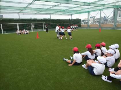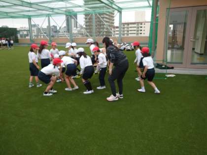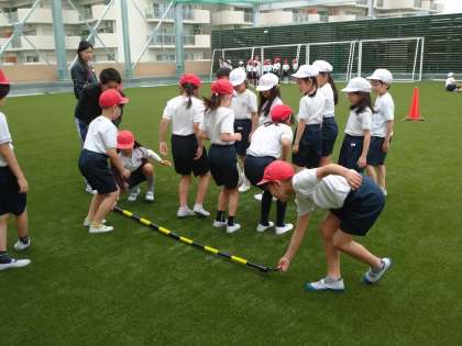 屋上運動場で運動会で行う団体競技の練習をしました。4人1組で走るだけでなく、待っている間もジャンプしたりかがんだりして、気が抜けません。まさに、団体がひとつになっての勝負です。