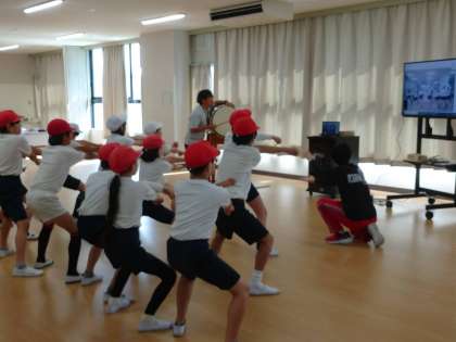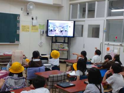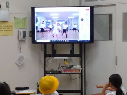 朝の時間、運動会の応援団が全クラスに応援の方法やタイミングをオンラインで伝えていました。