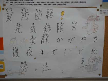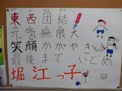 「東西団結!元気無限大 笑顔かがやき 最後までいどめ 堀江っ子」