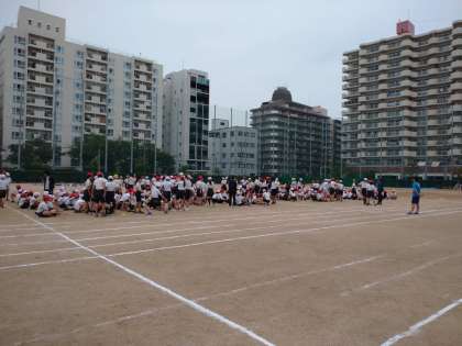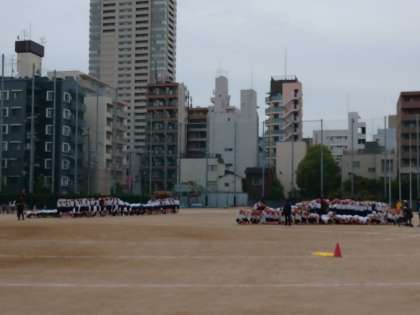 6年生が東西集まって、運動場で練習しました。団体演技の中で、肩を組んで波を作ります。人数が多いので、大きな波ができていました。