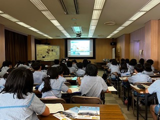 社会見学で西淀工場に行っています。職員とのあいさつの後、工場の様子をDVDで視聴しました。西淀工場にやってきたゴミがどのようにして処理されていくのか、形が変わったゴミがどのように使われるのかについての動画を、メモを取りながら真剣に聞いています。