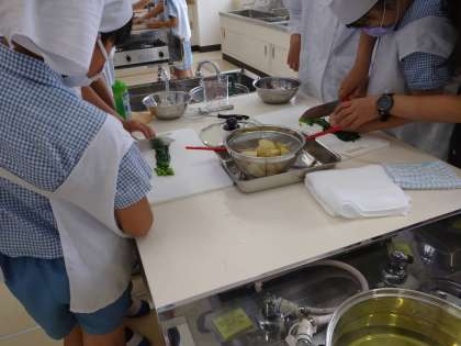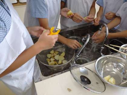 調理実習を行いました。今日の目標はホウレン草とジャガイモを茹でることです。ジャガイモは茹でてから皮をむき、芽も取り除きました。ホウレン草は茹でてから包丁で切り分けました。