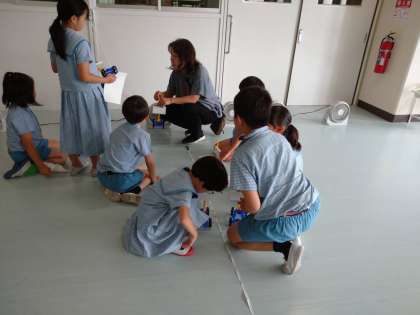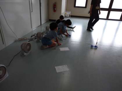 「風とゴムのはたらき」の学習で、キットの車にヨットのように帆をかけて、扇風機の風でどれぐらい進むか実験をしました。廊下がツルツルなので、少しの風でも長い距離を進むことができました。