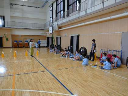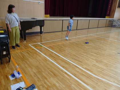 「風とゴムのはたらき」の学習で、先日は廊下で小さい扇風機を使って実験しましたが、今日は講堂で大型扇風機を使って実験しました。以前とは違って、とても強い風が発生しますので、車はとても長い距離を進んでいました。
