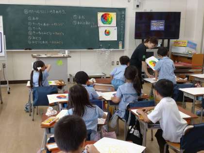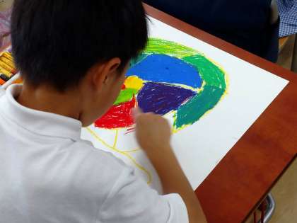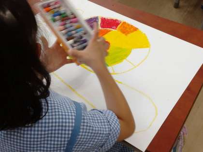 「カタツムリに色をぬろう」をテーマにパスで色を塗ります。単色だけでなく、青と赤で紫を作ったりして、混色にもチャレンジしていました。