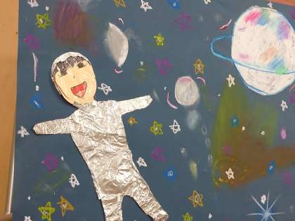 「宇宙であそぼう」をテーマに、まず人を描き、宇宙服に見立てたアルミホイルを巻いて宇宙飛行士を作りました。