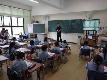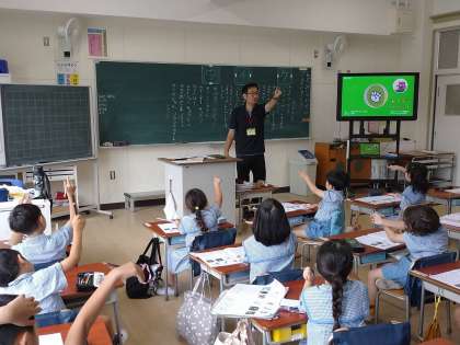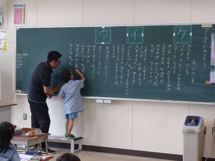 知っている言葉をたくさん出し合って、カタカナの世界が広がりました。最後に先生と一緒に空書き(そらがき)で筆順を確認しました。