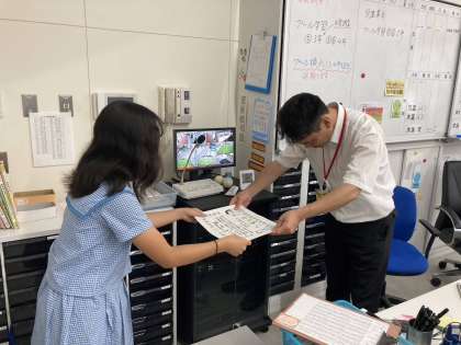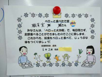 先月実施した「ペロッと大作戦【小おかず編】」で職員室も「ペロッと食べたで賞」を受賞し、給食委員から表彰を受けました。