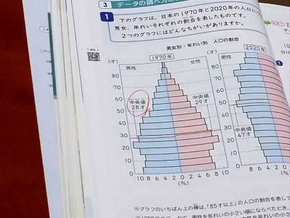 データの特徴を調べる学習で、1970年と2020年の男女別年齢分布のグラフを見比べて、気づいたことを発表しました。