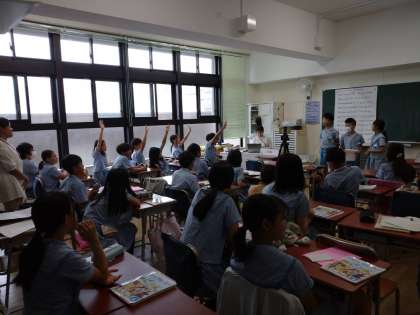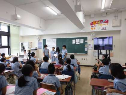 6年生が教職員に英語でインタビューした内容を英語で紹介しながら、グループごとにクイズを発表しました。誕生日や趣味といった内容から、正解は誰であるかを答えることはなかなか難しかったのですが、最後に似顔絵を示すことがヒントとなって、クイズは大盛り上がりとなりました。