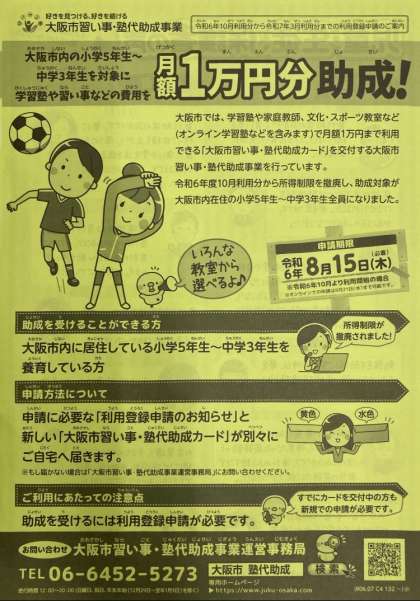 申請期限が夏休み中の8月15日(木)必着ですので、添付ファイルをご確認いただき、ご希望の方は大阪市習い事・塾代助成事業運営事務局までご連絡ください。