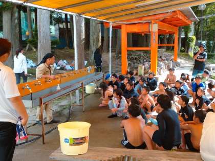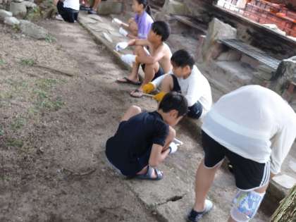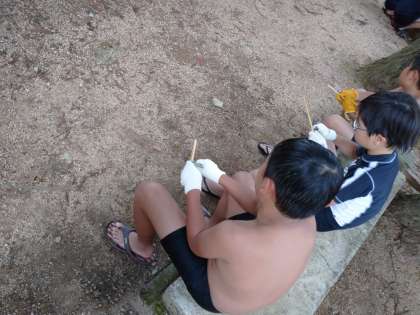 【林間学習】竹箸作り 公開日 2024/07/27 更新日 2024/07/27 5年生 水遊びで涼んだあと、竹箸作りをしました。 角ばった竹材をナイフでひたすら削っていきます。少しずつしか削れませんが、時間をかけて手を動かし続けると、竹材の角が取れ、だんだんと丸くなっていきます。夢中になって作業をし、なめらかな触り心地の竹箸を作っている人もいました。 最終日のお弁当はこの竹箸を使って食べます。楽しみです。 いいね(0)