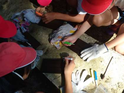 【林間学習】焼き板づくり 公開日 2024/07/28 更新日 2024/07/28 5年生 魚つかみと同時進行で、焼き板づくりを しました。 焼きを入れた板の煤を歯ブラシで落とし、タオルで磨きます。そうすると黒光りした木目があらわれます。そのあと、チューブ絵の具でハチ高原の思い出を描いていきました。一人一人の思い出ストーリーが描かれた作品はどれも興味深いものでした。 いいね(0)