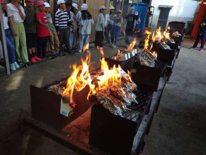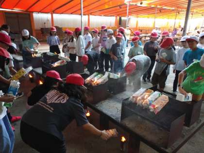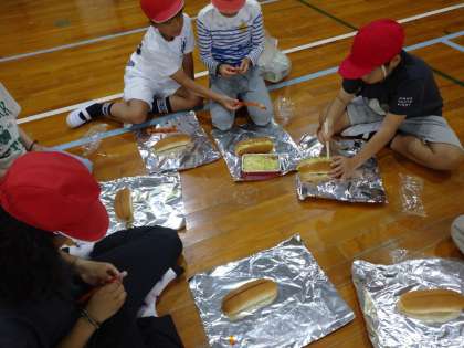 【林間学習】3日目朝食 カートンドッグ 公開日 2024/07/29 更新日 2024/07/29 5年生 3日目の朝食はカートンドッグです。 パンの切れ目にキャベツとソーセージをはさみ、アルミホイルでふんわり包み、1Lパックに入れて、パックを燃やして温めます。 風が強かったので、火をつける作業を怖がっていましたが、焼き上げることができました。 いいね(0)