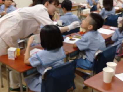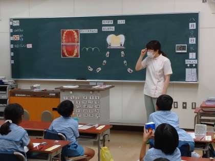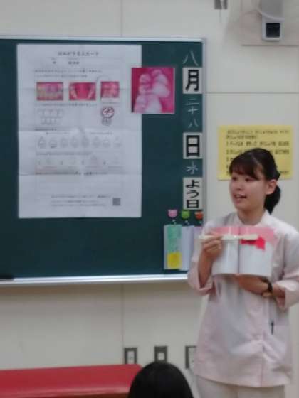 【2年生 歯みがき指導】 公開日 2024/08/28 更新日 2024/08/28 2年生 歯科衛生士に来ていただき、歯みがき指導を行いました。 特に磨き残しが多くなる奥歯について、なぜそうなるのか、米粒ほどの大きさの歯垢に億を超えるむし歯菌がいることなど、知らないことをたくさん教えていただきました。 そのあと、前歯の染めだしを行い、赤く残っているところを、教えていただいた上手な磨き方で磨きました。 これからも、むし歯にならないよう、歯みがきをていねいにしましょう! いいね(0)