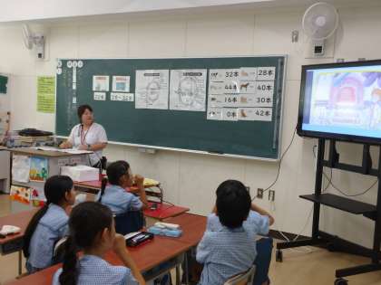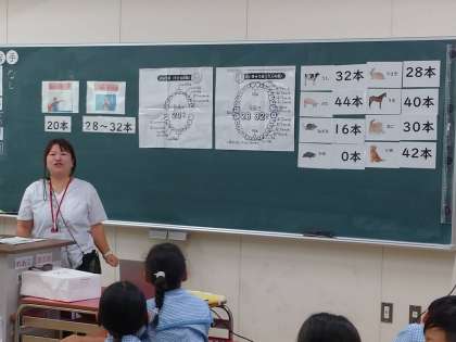 【4年生 保健指導】 公開日 2024/08/30 更新日 2024/08/30 4年生 今日は4年生で保健指導を行いました。 人間は成人で28〜32本歯があるのですが、牛や豚や馬などの動物の歯は何本あるのかを知りました。そして、肉食動物、草食動物、雑食動物の歯はどんな形のものかを学習しました。 動物と比べることで自分たちの歯のつくりや特徴を考え、それらの歯に合った磨き方を動画で確認しました。 いいね(0)